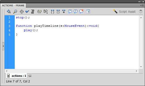 Pay very close attention to the elements the ActionScript window turns blue. Those are built-in elements. If mine is blue, but your's isn't, you're doing something wrong. ActionScript is case sensitive, so only capitalize the letters you see in my example:
