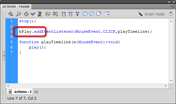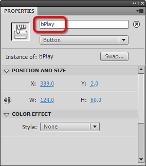 With the button still selected, we will assign the instance name bPlay using the Properties window: