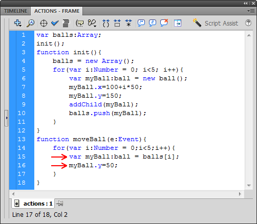 Notice that little shortcut in the moveBall function arguments. The first time we created on of these functions, we typed (event:Event). Now, we're taking a common ActionScript programming shortcut and abbreviating to (e:Event)