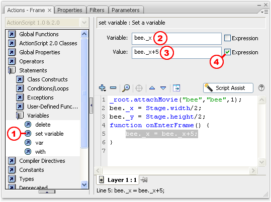 Now use set variable to repeatedly reset the bee's _x property (From now on, we'll try to use set variable to set properties, and var to declare variables) I want to move the bee five pixels to the right every time the frame "loops." So, we set bee._x (the bee's x position) equal to bee._x+5 (the bee's current x position, plus 5) Since my framerate is 24 frames/second, this should (hypothetically) move the bee 120px to the right every second: