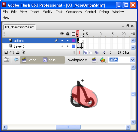 That's it! The nose MovieClip is going to be stuck at frame 1. Now we have to do some planning ahead. The goal is to click a button which will advance this timeline frame-by-frame. A problem will arise when we get to the final frame, where we want the timeline to loop back to frame 1 and stop. It won't do that automatically, so we'll make it.