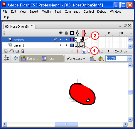 - Insert a Frame at the end of the nose layer. This will keep the animation from "blinking" when it momentarily hits a blank frame. The user will see the same image from frame 3 before the loop happens.
