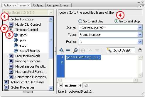 Return to the the Actions window and add a gotoAndStop(1); action to frame 4: