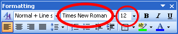 First, let's get the font correct. An MLA style essay will have the same serif typeface, Times New Roman, at the same size, 12 pixels, all the way through. There are no exceptions! If you are formatting an essay you've already written, select all of the text (CTRL+A) now. Use the Formatting toolbar to set the font: