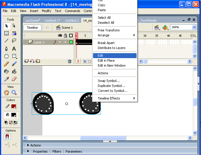Now add a car body that moves with the wheels. Right-Click on the car movieClip and choose Edit