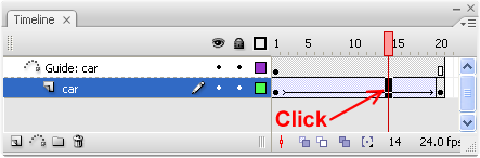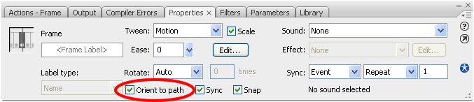 Our next Flash Trick is Orient To Path, which will cause the MovieClip to rotate around the guide as part of the tween. This feature is a Motion Tween property, so first click anywhere along the tween:
