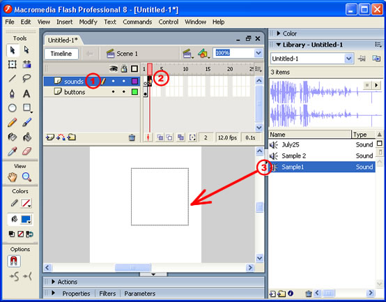- Drag-and-Drop a sound file from the Library to the Stage