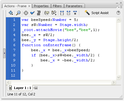 We'll be combining the multiple placement of objects from the previous lesson with the previous previous lesson, where we screen-wrapped a moving object using an onEnterFrame function and an if statement. The code looked like this: