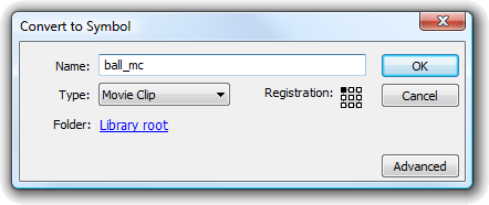 Right-Click and Convert To Symbol. Make it a Movie Clip with the name ball_mc: