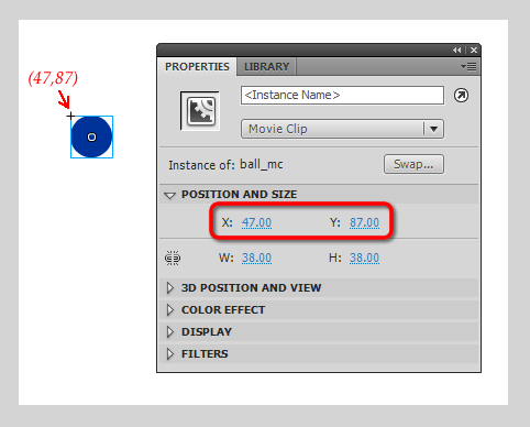 Now you can see how Flash forms that rectangle and calculates the position of an object. Just select the ball_mc MovieClip and a blue rectangle displays around it. The top left corner represents ball_mc's position on the stage: