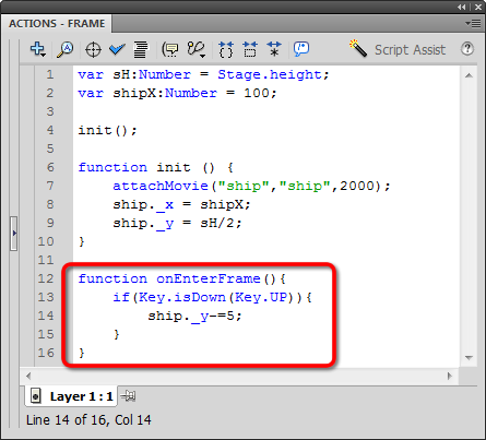 OK, time to test it out! Your ship should move up five pixels every time you press the UP key: