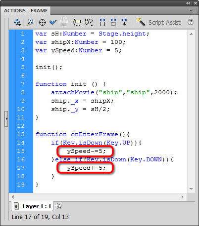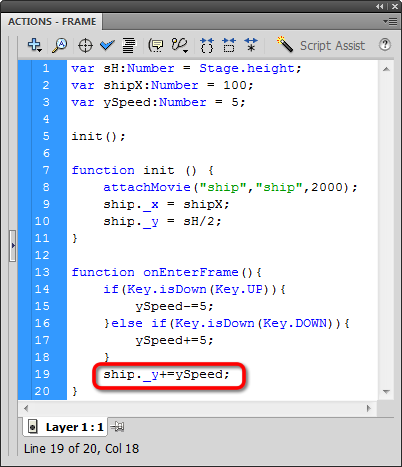 Key presses will now change the variable ySpeed... which means nothing will happen with the ship! Let's add ySpeed to ship._y contstantly. This command goes outside the conditional statements, but remains part of the onEnterFrame function: