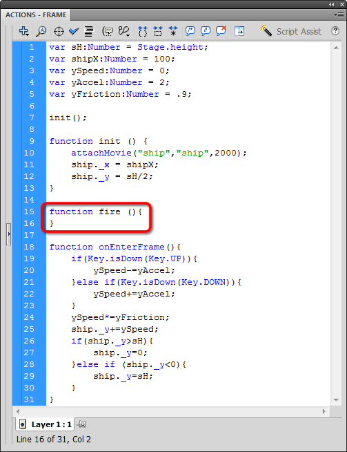 Create a new function called fire, which we'll use to attach a laser each time the space bar is pressed: