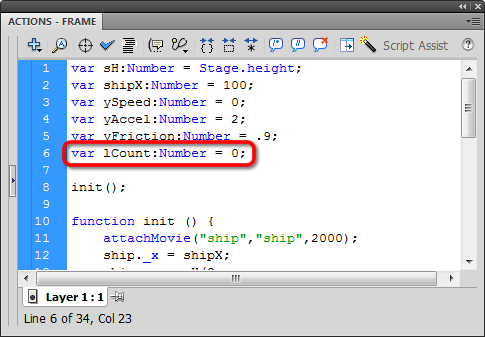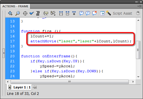 Increment a variable called lCount (that's the letter "l" for "laser", not the number "1") and attach an instance of laser: