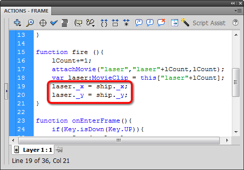 Set laser._x equal to ship._x, and do the same with the Y positioning: