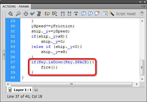 We did the if(Key.isDown()) conditionals in the previous exercise, so it shouldn't be much of a stretch for you to call the fire function when the SPACE key is pressed: