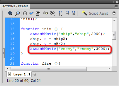 Return to the main Actions window. Your Actions should only be in one place, by the way. Attach a copy of enemy and put it at depth level 3000. Why 3000? I don't know, I just want it at a depth that won't conflict with anything else. If I tried to duplicate my successful attachment of the ship MovieClip at depth level 2000, well, I'd just replace the ship. We can only have one object at each depth: