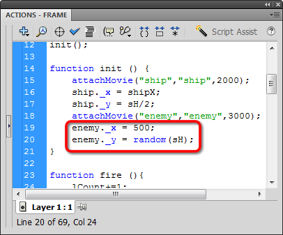 Now set the x and y properties of enemy. I decided to randomize the y position so it can be anywhere on the vertical stage, and place the x position at 500 for starters.