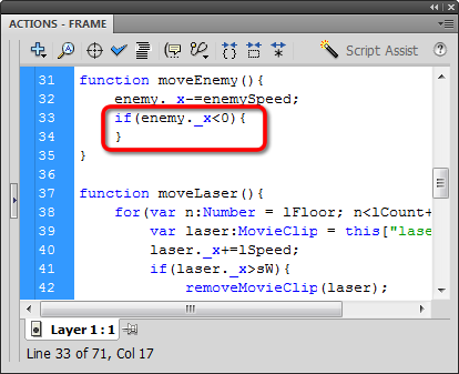 Obviously, we're working toward creating some sort of shoot-em-up space game. Right now we have to decide what we want to happen if our enemy makes it all the way across the Stage. Let's start an if statement in the moveEnemy function that checks to see if the X position is less than zero: