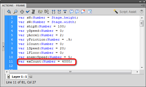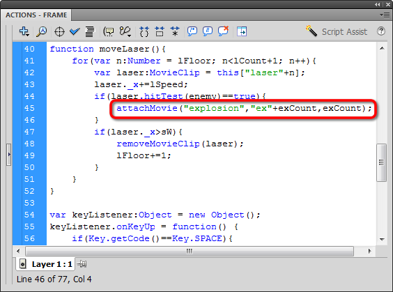 Now we'll attach a copy of the explosion we created at that the start of this project. "Explosion" is a rather long name for a MovieClip, so I'm going to assign the name "ex" and concatenate the variable exCount. I'll also set the depth level equal to exCount: