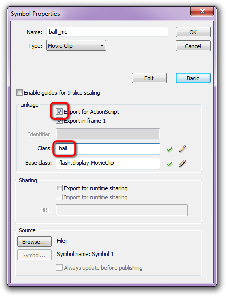 Bring up the Library window (CTRL+L is your keyboard shortcut). Right-Click your ball_mc MovieClip and select Properties: