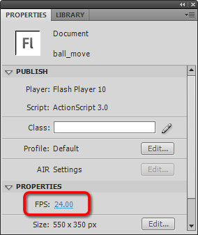 Theoretically, this thing is moving 24 pixels per second (in actuality, it's not quite that accurate, but it's close enough). You can experiment with different speeds by using Stage properties to modify the Frame Rate: