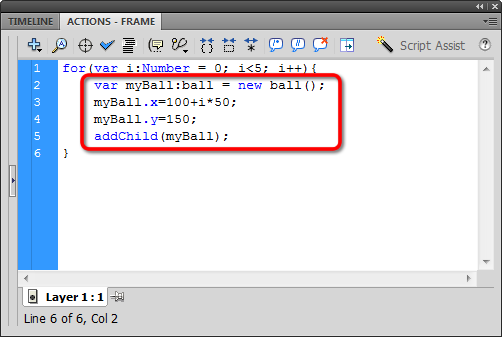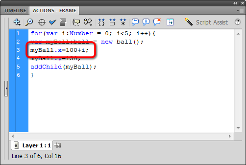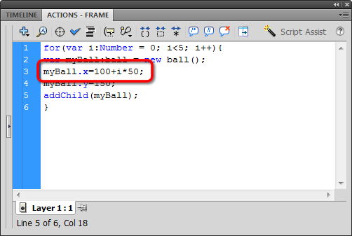 Maybe it's working, maybe it's not. I'm not seeing any errors in the compiler, but it looks like I still have just one ball on the stage. The problem is all they are stacked all on top of one another at (100,150). Let's do something about that!