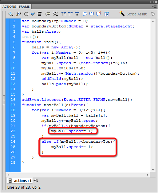 Great! Now we can flip the myBall.speed variables between positive and negative numbers exactly like we did when we bounced that single ball.
