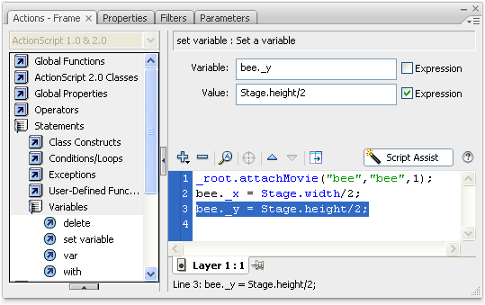 Test your work, then get the bee centered vertically! You can probably figure this out on your own, especially if you know that the y property of a movieClip is set using _y and the height of your stage is reference using Stage.height: