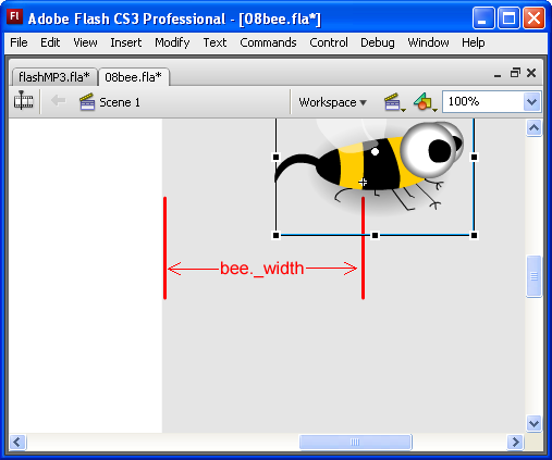Well, the problem is we are adding the entire width of the bee movieClip to the stage width, but the x point is in the middle of the bee. Therefore, we are getting about a bee-and-a-half off the stage before the conditional statement is met. Look at the illustration below: