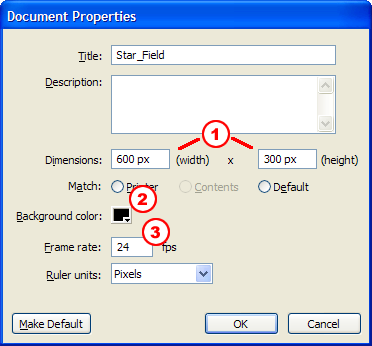 Let's start with some general setup stuff.... the real heart of this project comes later with the ActionScript. First, click Modify > Document to bring up the Document Properties dialogue box: