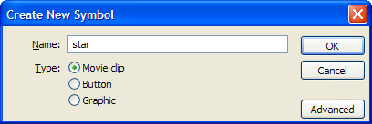 Now create a single star. Click Insert > New Symbol and Name the Movie clip star: