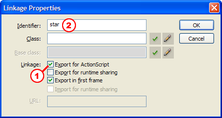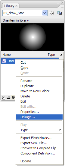 When you're done drawing, find the use the star movieClip in the Library panel, right-click and choose Linkage: