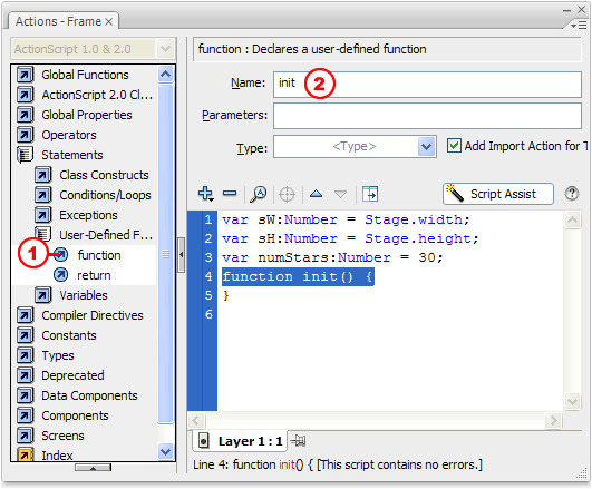 That's it for the declarations.... now lets get our initial actions to run with an init function. Remember, init isn't a "built-in" flash function. You can call this function just about anything you want, but it's fairly common for programmers to use init: