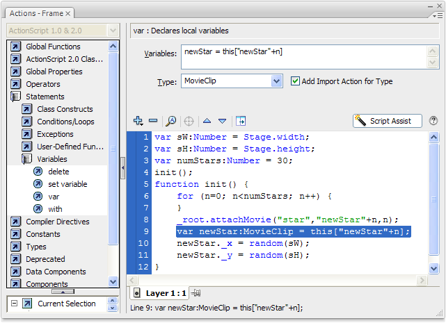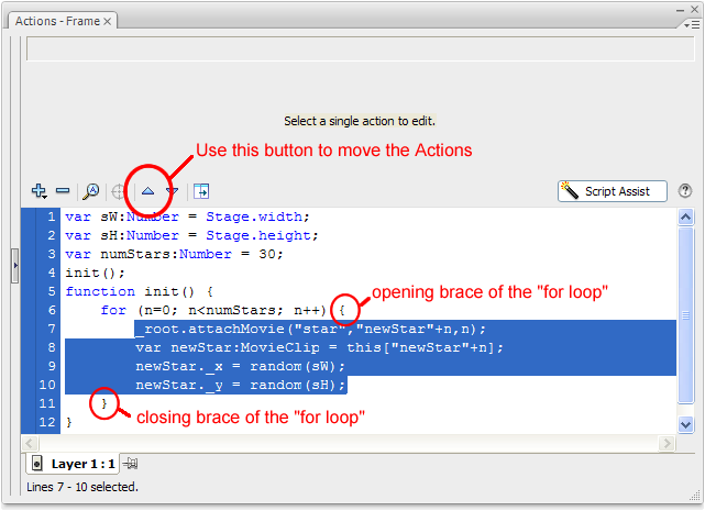 Now in order to take advantage of this for loop, you need to move all four lines of code (attachMovie, var, _x and _y) between the braces that make-up the for loop using the Move Selected Actions Up button: