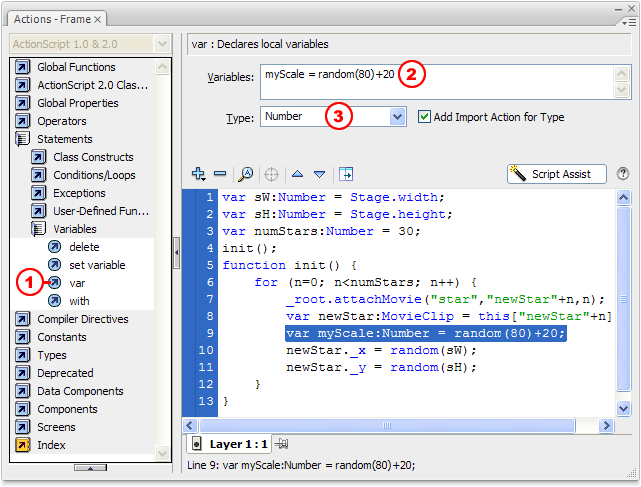 Now use set variable to set both the _xscale and _yscale of newStar equal to myScale: