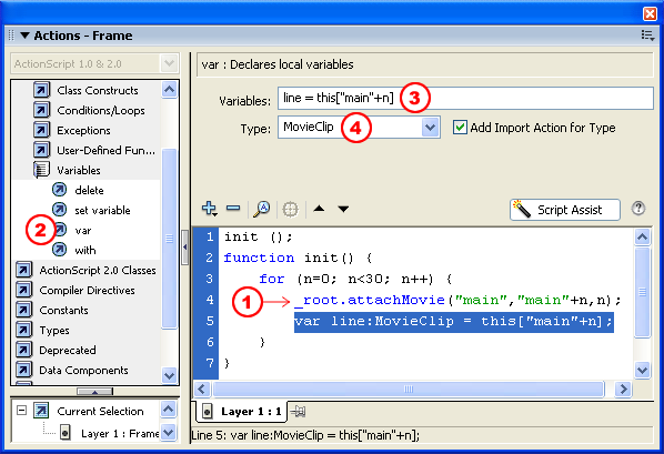 Instead, we will turn that MovieClip reference into a simple variable called line (again, I made up that variable name. It has nothing to do with any built-in functions). Then we can just use line every time we want to modify a property.