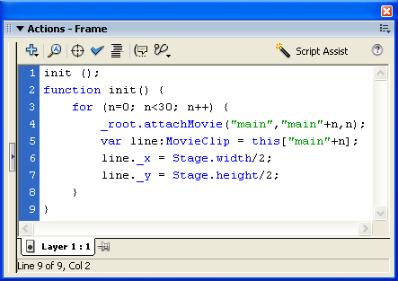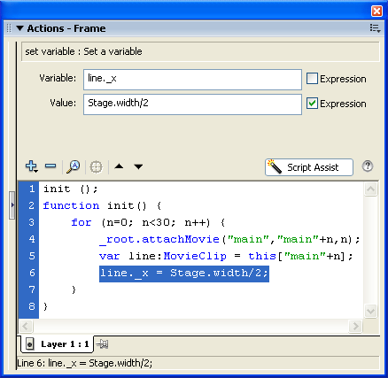 Let's center each of those MovieClips on the stage right after we attach them. Remember we have named each instance using "main"+n. You can reference the _x property of each clip using _root["main"+n]._x but you will have to repeatedly type that same string _root["main"+n] every time you set a new property (like _y or _rotation or _alpha)