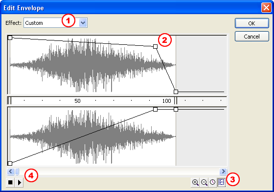 The Edit Edit Envelope dialogue box allows you to customize what's known as a sound envelope. Without getting too in-depth, let's just say the sound envelope shapes the amplitude (volume) of a sound. This is not unique to Flash! Any student of electronic music will instantly recognize the envelope, and talk in terms of Attack, Decay, Sustain, and Release. The sound envelope really defines the sound.