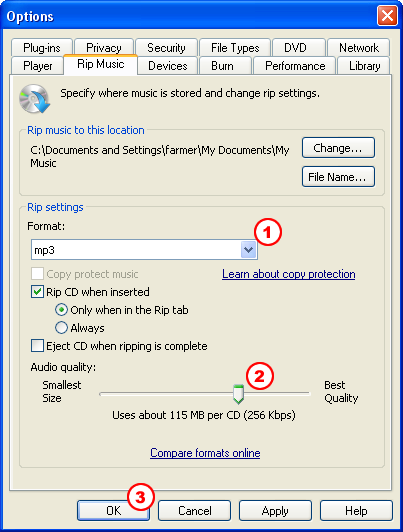 This is where we swap from Windows Media Audio(WMA) to MP3. You will also have the option of changing the Audio Quality settings, with the idea that you can make a compromise between small file sizes and good sound quality. Since we are going to import into Flash, which will also allow you to change the quality settings of a published file, I like to go for better quality in the source MP3.