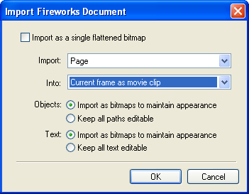 Navigate to the image you saved and Open it. Depending on the type of image you selected, you may get a dialogue box like the one below. If you do, click OK and your image will be imported right into a MovieClip for you: