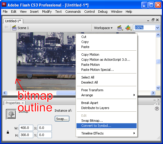 Most likely, Flash will import the Bitmap straight to the stage. You can easily spot a raw bitmap because Flash will display a spotty grey border around it. Immediately Right-Click on the bitmap and Convert to Symbol: