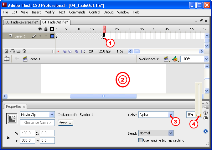 - Change the MovieClip Alpha to 0% (fully transparent)