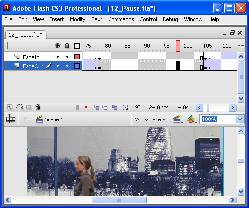 Add some static frames to the start, middle, and end of the animation in order to create a pause between transitions. In the screenshot below, you can see static frames between the keyframes on frame 78 and 105: