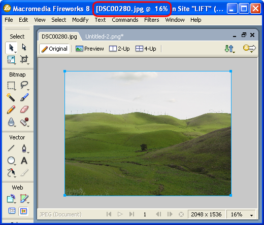 The first thing you want to look at is the size of your image. Fireworks is cool because you can see the zoom level at the top of the program window. My current zoom is 16%, which means the image is I'm working with is HUGE: