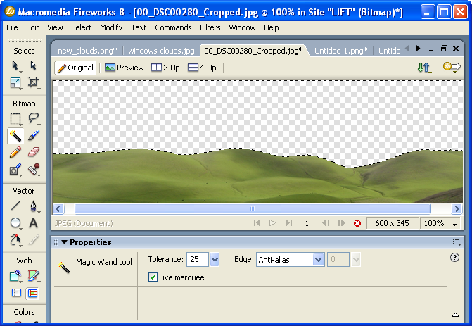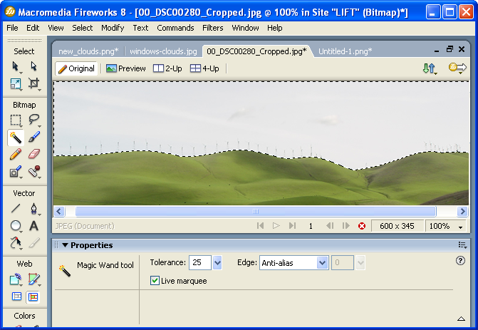 Open up the file in Fireworks and use the Magic Wand Tool to select the sky area. Make adjustments to the Magic Wand properties until you strike a good balance, and all of the sky is selected, without getting any of the hills.