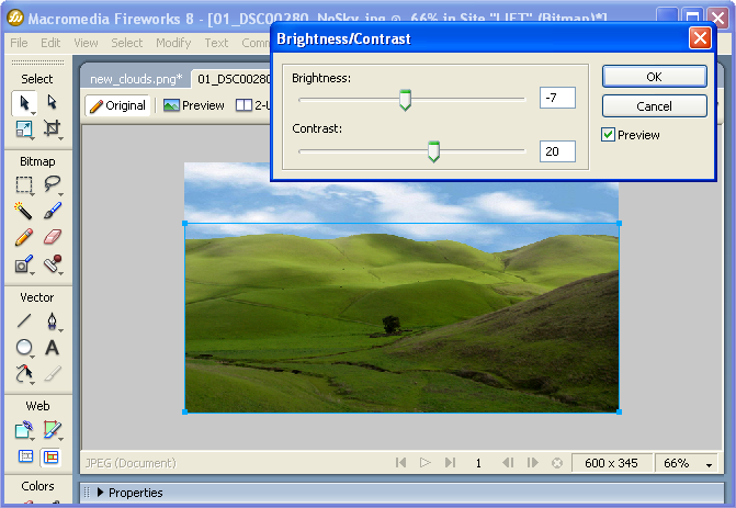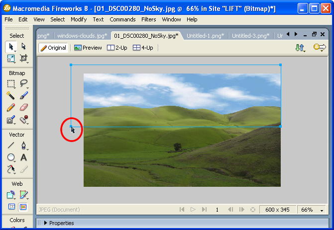 Now let's fine tune the bitmaps before we move over to Flash. I'm going to stretch and resize the sky. Grab the Pointer tool, then drag one of the corner handles until you're happy with the results. Notice how I made the sky wider than the visible are of the image... I want it to overlap a little so I can animate the image later: