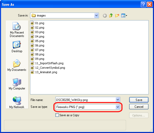 Let's try it! Choose File > Save As and change the file type to Fireworks PNG:
