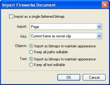 When the Import Fireworks Document dialogue box pops up, make certain the single flattened bitmap box is deselected. In fact, make it look like mine: