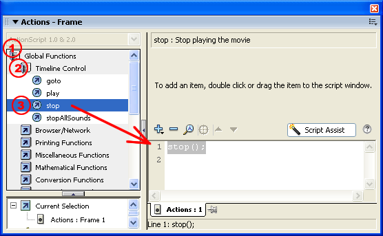 3. Double-Click to add the stop action to the timeline. Script Assist will add the extra marks to make the code legitimate: stop();